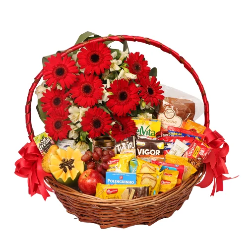 A Cesta de Café da Manhã Bom Dia é perfeita para surpreender alguém especial logo nas primeiras horas do dia. Contém uma seleção de produtos deliciosos, como queijo, geleia, bolachinhas, torradas, suco e frutas. Tudo cuidadosamente disposto em uma elegante cesta de vime com alça, tornando o presente ainda mais especial.